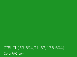 CIELCh 53.894,71.37,138.604 Color is a normal green color and the nearest color is Forest Green #228b22. Hex code #1c9525 and RGB value is rgb(28,149,37). In RGB color space, this color is composed of 11% red, 58% green, 15% blue, In CMYK color space, this color is composed of 81% cyan, 0% magenta, 75% yellow , 42% black , In HSL color space, this color has a hue angle of 124° , 68% saturation and 35% lightness.
