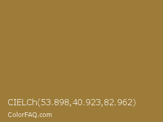 CIELCh 53.898,40.923,82.962 Color is a normal orange color and the nearest color is Metallic Sunburst #9c7c38. Hex code #9d7c39 and RGB value is rgb(157,124,57). In RGB color space, this color is composed of 62% red, 49% green, 22% blue, In CMYK color space, this color is composed of 0% cyan, 21% magenta, 64% yellow , 38% black , In HSL color space, this color has a hue angle of 40° , 47% saturation and 42% lightness.
