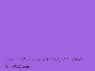 CIELCh 53.902,73.152,311.786 Color is a light violet color and the nearest color is Dark Pastel Purple #966fd6. Hex code #a163e0 and RGB value is rgb(161,99,224). In RGB color space, this color is composed of 63% red, 39% green, 88% blue, In CMYK color space, this color is composed of 28% cyan, 56% magenta, 0% yellow , 12% black , In HSL color space, this color has a hue angle of 270° , 67% saturation and 63% lightness.