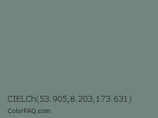 CIELCh 53.905,8.203,173.631 Color is a normal green color and the nearest color is Blue Smoke #748881. Hex code #72857f and RGB value is rgb(114,133,127). In RGB color space, this color is composed of 45% red, 52% green, 50% blue, In CMYK color space, this color is composed of 14% cyan, 0% magenta, 5% yellow , 48% black , In HSL color space, this color has a hue angle of 161° , 8% saturation and 48% lightness.