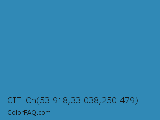 CIELCh 53.918,33.038,250.479 Color is a normal blue color and the nearest color is Boston Blue #3b91b4. Hex code #3089b6 and RGB value is rgb(48,137,182). In RGB color space, this color is composed of 19% red, 54% green, 71% blue, In CMYK color space, this color is composed of 74% cyan, 25% magenta, 0% yellow , 29% black , In HSL color space, this color has a hue angle of 200° , 58% saturation and 45% lightness.