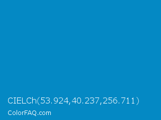 CIELCh 53.924,40.237,256.711 Color is a normal blue color and the nearest color is Blue NCS #0087bd. Hex code #0489c4 and RGB value is rgb(4,137,196). In RGB color space, this color is composed of 2% red, 54% green, 77% blue, In CMYK color space, this color is composed of 98% cyan, 30% magenta, 0% yellow , 23% black , In HSL color space, this color has a hue angle of 198° , 96% saturation and 39% lightness.