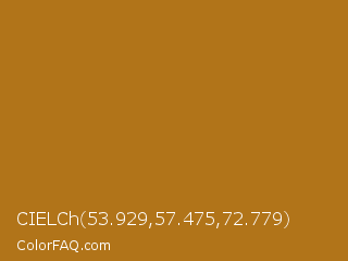 CIELCh 53.929,57.475,72.779 Color is a normal orange color and the nearest color is Mandalay #ad781b. Hex code #b17419 and RGB value is rgb(177,116,25). In RGB color space, this color is composed of 69% red, 45% green, 10% blue, In CMYK color space, this color is composed of 0% cyan, 34% magenta, 86% yellow , 31% black , In HSL color space, this color has a hue angle of 36° , 75% saturation and 40% lightness.