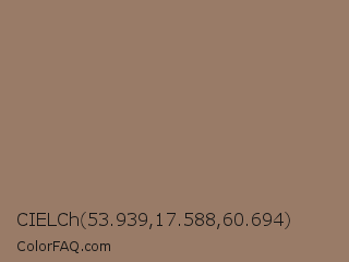 CIELCh 53.939,17.588,60.694 Color is a normal orange color and the nearest color is Beaver #9f8170. Hex code #997b67 and RGB value is rgb(153,123,103). In RGB color space, this color is composed of 60% red, 48% green, 40% blue, In CMYK color space, this color is composed of 0% cyan, 20% magenta, 33% yellow , 40% black , In HSL color space, this color has a hue angle of 24° , 20% saturation and 50% lightness.