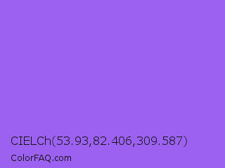 CIELCh 53.93,82.406,309.587 Color is a light violet color and the nearest color is Navy Purple #9457eb. Hex code #9c61f0 and RGB value is rgb(156,97,240). In RGB color space, this color is composed of 61% red, 38% green, 94% blue, In CMYK color space, this color is composed of 35% cyan, 60% magenta, 0% yellow , 6% black , In HSL color space, this color has a hue angle of 265° , 83% saturation and 66% lightness.