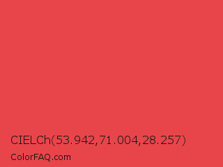 CIELCh 53.942,71.004,28.257 Color is a normal red color and the nearest color is Carmine Pink #eb4c42. Hex code #e8454b and RGB value is rgb(232,69,75). In RGB color space, this color is composed of 91% red, 27% green, 29% blue, In CMYK color space, this color is composed of 0% cyan, 70% magenta, 68% yellow , 9% black , In HSL color space, this color has a hue angle of 358° , 78% saturation and 59% lightness.