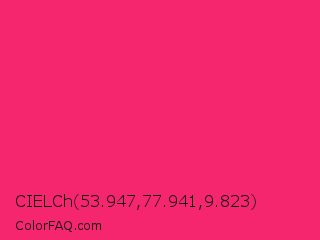 CIELCh 53.947,77.941,9.823 Color is a normal rose color and the nearest color is Razzmatazz #e3256b. Hex code #f5266e and RGB value is rgb(245,38,110). In RGB color space, this color is composed of 96% red, 15% green, 43% blue, In CMYK color space, this color is composed of 0% cyan, 84% magenta, 55% yellow , 4% black , In HSL color space, this color has a hue angle of 339° , 91% saturation and 55% lightness.