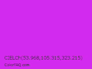 CIELCh 53.968,105.315,323.215 Color is a normal magenta color and the nearest color is Steel Pink #cc33cc. Hex code #d42af0 and RGB value is rgb(212,42,240). In RGB color space, this color is composed of 83% red, 16% green, 94% blue, In CMYK color space, this color is composed of 12% cyan, 83% magenta, 0% yellow , 6% black , In HSL color space, this color has a hue angle of 292° , 87% saturation and 55% lightness.