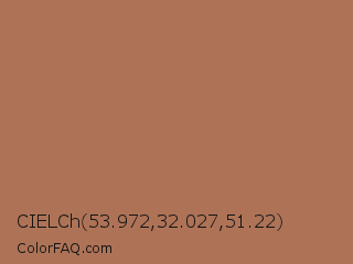 CIELCh 53.972,32.027,51.22 Color is a normal orange color and the nearest color is Santa Fe #b16d52. Hex code #ae7357 and RGB value is rgb(174,115,87). In RGB color space, this color is composed of 68% red, 45% green, 34% blue, In CMYK color space, this color is composed of 0% cyan, 34% magenta, 50% yellow , 32% black , In HSL color space, this color has a hue angle of 19° , 35% saturation and 51% lightness.