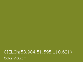 CIELCh 53.984,51.595,110.621 Color is a normal yellow color and the nearest color is Wasabi #788a25. Hex code #7b8826 and RGB value is rgb(123,136,38). In RGB color space, this color is composed of 48% red, 53% green, 15% blue, In CMYK color space, this color is composed of 10% cyan, 0% magenta, 72% yellow , 47% black , In HSL color space, this color has a hue angle of 68° , 56% saturation and 34% lightness.