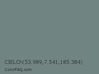 CIELCh 53.989,7.541,185.384 Color is a normal cyan color and the nearest color is Blue Smoke #748881. Hex code #728582 and RGB value is rgb(114,133,130). In RGB color space, this color is composed of 45% red, 52% green, 51% blue, In CMYK color space, this color is composed of 14% cyan, 0% magenta, 2% yellow , 48% black , In HSL color space, this color has a hue angle of 171° , 8% saturation and 48% lightness.