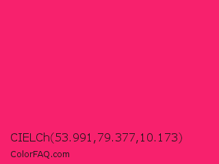 CIELCh 53.991,79.377,10.173 Color is a normal rose color and the nearest color is Razzmatazz #e3256b. Hex code #f7216d and RGB value is rgb(247,33,109). In RGB color space, this color is composed of 97% red, 13% green, 43% blue, In CMYK color space, this color is composed of 0% cyan, 87% magenta, 56% yellow , 3% black , In HSL color space, this color has a hue angle of 339° , 93% saturation and 55% lightness.
