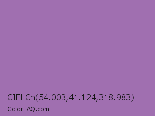 CIELCh 54.003,41.124,318.983 Color is a normal purple color and the nearest color is Wisteria #9771b5. Hex code #a06fb0 and RGB value is rgb(160,111,176). In RGB color space, this color is composed of 63% red, 44% green, 69% blue, In CMYK color space, this color is composed of 9% cyan, 37% magenta, 0% yellow , 31% black , In HSL color space, this color has a hue angle of 285° , 29% saturation and 56% lightness.