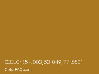 CIELCh 54.003,53.049,77.562 Color is a normal orange color and the nearest color is Mandalay #ad781b. Hex code #a97821 and RGB value is rgb(169,120,33). In RGB color space, this color is composed of 66% red, 47% green, 13% blue, In CMYK color space, this color is composed of 0% cyan, 29% magenta, 80% yellow , 34% black , In HSL color space, this color has a hue angle of 38° , 67% saturation and 40% lightness.