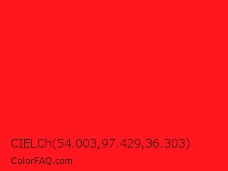 CIELCh 54.003,97.429,36.303 Color is a normal red color and the nearest color is Vivid Red #f70d1a. Hex code #ff1720 and RGB value is rgb(255,23,32). In RGB color space, this color is composed of 100% red, 9% green, 13% blue, In CMYK color space, this color is composed of 0% cyan, 91% magenta, 87% yellow , 0% black , In HSL color space, this color has a hue angle of 358° , 100% saturation and 55% lightness.