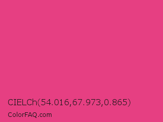 CIELCh 54.016,67.973,0.865 Color is a normal rose color and the nearest color is Cerise Pink #ec3b83. Hex code #e63f82 and RGB value is rgb(230,63,130). In RGB color space, this color is composed of 90% red, 25% green, 51% blue, In CMYK color space, this color is composed of 0% cyan, 73% magenta, 43% yellow , 10% black , In HSL color space, this color has a hue angle of 336° , 77% saturation and 57% lightness.