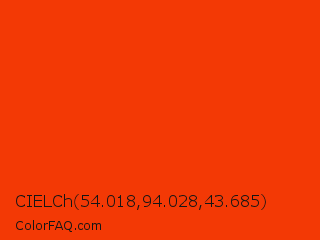 CIELCh 54.018,94.028,43.685 Color is a normal red color and the nearest color is Coquelicot #ff3800. Hex code #f33905 and RGB value is rgb(243,57,5). In RGB color space, this color is composed of 95% red, 22% green, 2% blue, In CMYK color space, this color is composed of 0% cyan, 77% magenta, 98% yellow , 5% black , In HSL color space, this color has a hue angle of 13° , 96% saturation and 49% lightness.