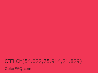 CIELCh 54.022,75.914,21.829 Color is a normal red color and the nearest color is Desire #ea3c53. Hex code #f13655 and RGB value is rgb(241,54,85). In RGB color space, this color is composed of 95% red, 21% green, 33% blue, In CMYK color space, this color is composed of 0% cyan, 78% magenta, 65% yellow , 5% black , In HSL color space, this color has a hue angle of 350° , 87% saturation and 58% lightness.