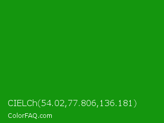 CIELCh 54.02,77.806,136.181 Color is a normal green color and the nearest color is India Green #138808. Hex code #14960e and RGB value is rgb(20,150,14). In RGB color space, this color is composed of 8% red, 59% green, 5% blue, In CMYK color space, this color is composed of 87% cyan, 0% magenta, 91% yellow , 41% black , In HSL color space, this color has a hue angle of 117° , 83% saturation and 32% lightness.