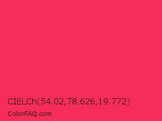 CIELCh 54.02,78.626,19.772 Color is a normal red color and the nearest color is Radical Red #ff355e. Hex code #f52d58 and RGB value is rgb(245,45,88). In RGB color space, this color is composed of 96% red, 18% green, 35% blue, In CMYK color space, this color is composed of 0% cyan, 82% magenta, 64% yellow , 4% black , In HSL color space, this color has a hue angle of 347° , 91% saturation and 57% lightness.