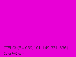 CIELCh 54.039,101.149,331.636 Color is a normal magenta color and the nearest color is Purple Pizzazz #ff00cc. Hex code #e800d6 and RGB value is rgb(232,0,214). In RGB color space, this color is composed of 91% red, 0% green, 84% blue, In CMYK color space, this color is composed of 0% cyan, 100% magenta, 8% yellow , 9% black , In HSL color space, this color has a hue angle of 305° , 100% saturation and 45% lightness.