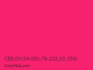 CIELCh 54.051,79.222,10.254 Color is a normal rose color and the nearest color is Razzmatazz #e3256b. Hex code #f7226d and RGB value is rgb(247,34,109). In RGB color space, this color is composed of 97% red, 13% green, 43% blue, In CMYK color space, this color is composed of 0% cyan, 86% magenta, 56% yellow , 3% black , In HSL color space, this color has a hue angle of 339° , 93% saturation and 55% lightness.