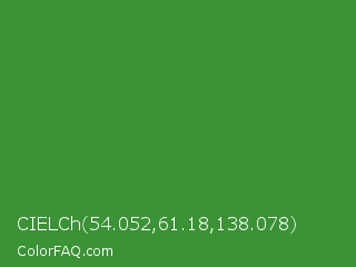 CIELCh 54.052,61.18,138.078 Color is a normal green color and the nearest color is May Green #4c9141. Hex code #3a9335 and RGB value is rgb(58,147,53). In RGB color space, this color is composed of 23% red, 58% green, 21% blue, In CMYK color space, this color is composed of 61% cyan, 0% magenta, 64% yellow , 42% black , In HSL color space, this color has a hue angle of 117° , 47% saturation and 39% lightness.