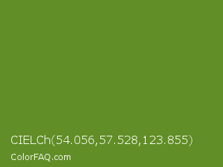 CIELCh 54.056,57.528,123.855 Color is a normal green color and the nearest color is Olive Drab #6b8e23. Hex code #618e26 and RGB value is rgb(97,142,38). In RGB color space, this color is composed of 38% red, 56% green, 15% blue, In CMYK color space, this color is composed of 32% cyan, 0% magenta, 73% yellow , 44% black , In HSL color space, this color has a hue angle of 86° , 58% saturation and 35% lightness.
