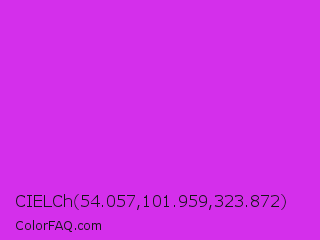 CIELCh 54.057,101.959,323.872 Color is a normal magenta color and the nearest color is Steel Pink #cc33cc. Hex code #d42feb and RGB value is rgb(212,47,235). In RGB color space, this color is composed of 83% red, 18% green, 92% blue, In CMYK color space, this color is composed of 10% cyan, 80% magenta, 0% yellow , 8% black , In HSL color space, this color has a hue angle of 293° , 82% saturation and 55% lightness.