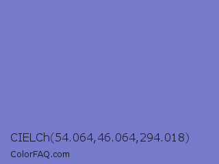 CIELCh 54.064,46.064,294.018 Color is a light blue color and the nearest color is Moody Blue #7f76d3. Hex code #767aca and RGB value is rgb(118,122,202). In RGB color space, this color is composed of 46% red, 48% green, 79% blue, In CMYK color space, this color is composed of 42% cyan, 40% magenta, 0% yellow , 21% black , In HSL color space, this color has a hue angle of 237° , 44% saturation and 63% lightness.