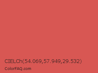 CIELCh 54.069,57.949,29.532 Color is a normal red color and the nearest color is Jelly Bean #da614e. Hex code #d85753 and RGB value is rgb(216,87,83). In RGB color space, this color is composed of 85% red, 34% green, 33% blue, In CMYK color space, this color is composed of 0% cyan, 60% magenta, 62% yellow , 15% black , In HSL color space, this color has a hue angle of 2° , 63% saturation and 59% lightness.