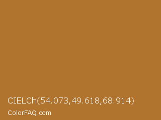 CIELCh 54.073,49.618,68.914 Color is a normal orange color and the nearest color is Copper #b87333. Hex code #b1742f and RGB value is rgb(177,116,47). In RGB color space, this color is composed of 69% red, 45% green, 18% blue, In CMYK color space, this color is composed of 0% cyan, 34% magenta, 73% yellow , 31% black , In HSL color space, this color has a hue angle of 32° , 58% saturation and 44% lightness.