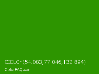 CIELCh 54.083,77.046,132.894 Color is a dark green color and the nearest color is Napier Green #2a8000. Hex code #2d9500 and RGB value is rgb(45,149,0). In RGB color space, this color is composed of 18% red, 58% green, 0% blue, In CMYK color space, this color is composed of 70% cyan, 0% magenta, 100% yellow , 42% black , In HSL color space, this color has a hue angle of 102° , 100% saturation and 29% lightness.