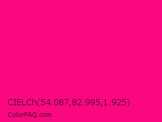 CIELCh 54.087,82.995,1.925 Color is a normal rose color and the nearest color is Rose #ff007f. Hex code #fa0880 and RGB value is rgb(250,8,128). In RGB color space, this color is composed of 98% red, 3% green, 50% blue, In CMYK color space, this color is composed of 0% cyan, 97% magenta, 49% yellow , 2% black , In HSL color space, this color has a hue angle of 330° , 96% saturation and 51% lightness.