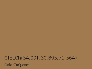 CIELCh 54.091,30.895,71.564 Color is a normal orange color and the nearest color is Dirt #9b7653. Hex code #a17a4f and RGB value is rgb(161,122,79). In RGB color space, this color is composed of 63% red, 48% green, 31% blue, In CMYK color space, this color is composed of 0% cyan, 24% magenta, 51% yellow , 37% black , In HSL color space, this color has a hue angle of 31° , 34% saturation and 47% lightness.
