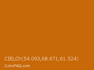 CIELCh 54.093,68.671,61.524 Color is a normal orange color and the nearest color is Indochine #c26b03. Hex code #c76809 and RGB value is rgb(199,104,9). In RGB color space, this color is composed of 78% red, 41% green, 4% blue, In CMYK color space, this color is composed of 0% cyan, 48% magenta, 95% yellow , 22% black , In HSL color space, this color has a hue angle of 30° , 91% saturation and 41% lightness.