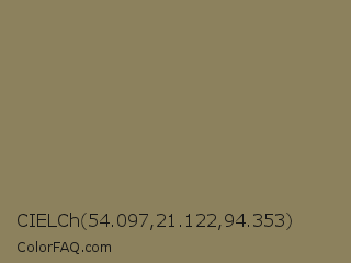 CIELCh 54.097,21.122,94.353 Color is a normal yellow color and the nearest color is Clay Creek #8a8360. Hex code #8c815d and RGB value is rgb(140,129,93). In RGB color space, this color is composed of 55% red, 51% green, 36% blue, In CMYK color space, this color is composed of 0% cyan, 8% magenta, 34% yellow , 45% black , In HSL color space, this color has a hue angle of 46° , 20% saturation and 46% lightness.