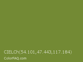 CIELCh 54.101,47.443,117.184 Color is a normal lime color and the nearest color is Wasabi #788a25. Hex code #738a34 and RGB value is rgb(115,138,52). In RGB color space, this color is composed of 45% red, 54% green, 20% blue, In CMYK color space, this color is composed of 17% cyan, 0% magenta, 62% yellow , 46% black , In HSL color space, this color has a hue angle of 76° , 45% saturation and 37% lightness.