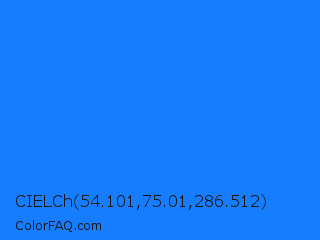 CIELCh 54.101,75.01,286.512 Color is a normal blue color and the nearest color is Blue Crayola #1f75fe. Hex code #177dff and RGB value is rgb(23,125,255). In RGB color space, this color is composed of 9% red, 49% green, 100% blue, In CMYK color space, this color is composed of 91% cyan, 51% magenta, 0% yellow , 0% black , In HSL color space, this color has a hue angle of 214° , 100% saturation and 55% lightness.