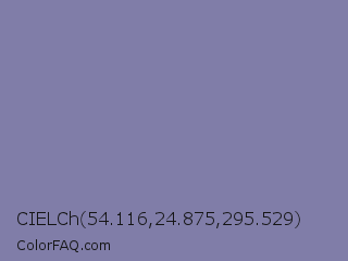 CIELCh 54.116,24.875,295.529 Color is a normal indigo color and the nearest color is Shadow Blue #778ba5. Hex code #807da8 and RGB value is rgb(128,125,168). In RGB color space, this color is composed of 50% red, 49% green, 66% blue, In CMYK color space, this color is composed of 24% cyan, 26% magenta, 0% yellow , 34% black , In HSL color space, this color has a hue angle of 244° , 20% saturation and 57% lightness.
