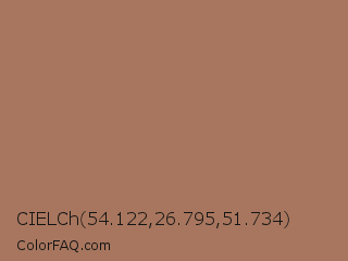CIELCh 54.122,26.795,51.734 Color is a normal orange color and the nearest color is French Beige #a67b5b. Hex code #a8765e and RGB value is rgb(168,118,94). In RGB color space, this color is composed of 66% red, 46% green, 37% blue, In CMYK color space, this color is composed of 0% cyan, 30% magenta, 44% yellow , 34% black , In HSL color space, this color has a hue angle of 19° , 30% saturation and 51% lightness.
