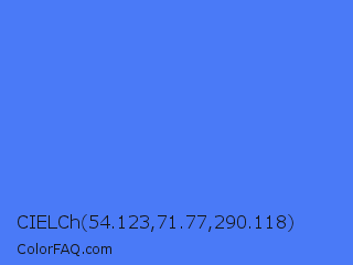 CIELCh 54.123,71.77,290.118 Color is a light blue color and the nearest color is Blueberry #4f86f7. Hex code #4a7af7 and RGB value is rgb(74,122,247). In RGB color space, this color is composed of 29% red, 48% green, 97% blue, In CMYK color space, this color is composed of 70% cyan, 51% magenta, 0% yellow , 3% black , In HSL color space, this color has a hue angle of 223° , 92% saturation and 63% lightness.