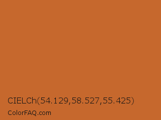 CIELCh 54.129,58.527,55.425 Color is a normal orange color and the nearest color is Piper #c96323. Hex code #c6682d and RGB value is rgb(198,104,45). In RGB color space, this color is composed of 78% red, 41% green, 18% blue, In CMYK color space, this color is composed of 0% cyan, 47% magenta, 77% yellow , 22% black , In HSL color space, this color has a hue angle of 23° , 63% saturation and 48% lightness.