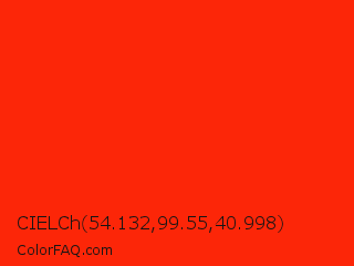 CIELCh 54.132,99.55,40.998 Color is a normal red color and the nearest color is Scarlet #ff2400. Hex code #fc2608 and RGB value is rgb(252,38,8). In RGB color space, this color is composed of 99% red, 15% green, 3% blue, In CMYK color space, this color is composed of 0% cyan, 85% magenta, 97% yellow , 1% black , In HSL color space, this color has a hue angle of 7° , 98% saturation and 51% lightness.
