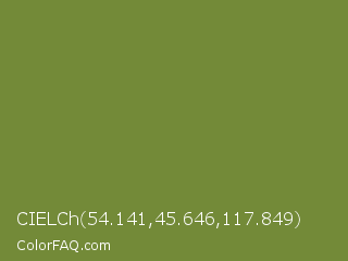 CIELCh 54.141,45.646,117.849 Color is a normal lime color and the nearest color is Palm Leaf #6f9940. Hex code #738a38 and RGB value is rgb(115,138,56). In RGB color space, this color is composed of 45% red, 54% green, 22% blue, In CMYK color space, this color is composed of 17% cyan, 0% magenta, 59% yellow , 46% black , In HSL color space, this color has a hue angle of 77° , 42% saturation and 38% lightness.