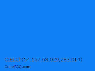 CIELCh 54.167,68.029,283.014 Color is a normal blue color and the nearest color is Azure Radiance #007fff. Hex code #0f80f5 and RGB value is rgb(15,128,245). In RGB color space, this color is composed of 6% red, 50% green, 96% blue, In CMYK color space, this color is composed of 94% cyan, 48% magenta, 0% yellow , 4% black , In HSL color space, this color has a hue angle of 211° , 92% saturation and 51% lightness.
