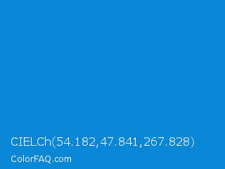 CIELCh 54.182,47.841,267.828 Color is a normal blue color and the nearest color is Rich Electric Blue #0892d0. Hex code #0a87d4 and RGB value is rgb(10,135,212). In RGB color space, this color is composed of 4% red, 53% green, 83% blue, In CMYK color space, this color is composed of 95% cyan, 36% magenta, 0% yellow , 17% black , In HSL color space, this color has a hue angle of 203° , 91% saturation and 44% lightness.