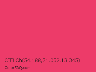 CIELCh 54.188,71.052,13.345 Color is a normal rose color and the nearest color is Paradise Pink #e63e62. Hex code #ed3b69 and RGB value is rgb(237,59,105). In RGB color space, this color is composed of 93% red, 23% green, 41% blue, In CMYK color space, this color is composed of 0% cyan, 75% magenta, 56% yellow , 7% black , In HSL color space, this color has a hue angle of 344° , 83% saturation and 58% lightness.