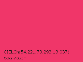 CIELCh 54.221,73.293,13.037 Color is a normal rose color and the nearest color is Paradise Pink #e63e62. Hex code #f03669 and RGB value is rgb(240,54,105). In RGB color space, this color is composed of 94% red, 21% green, 41% blue, In CMYK color space, this color is composed of 0% cyan, 78% magenta, 56% yellow , 6% black , In HSL color space, this color has a hue angle of 344° , 86% saturation and 58% lightness.