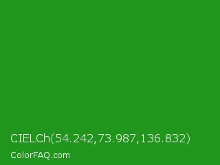 CIELCh 54.242,73.987,136.832 Color is a normal green color and the nearest color is Slimy Green #299617. Hex code #20961c and RGB value is rgb(32,150,28). In RGB color space, this color is composed of 13% red, 59% green, 11% blue, In CMYK color space, this color is composed of 79% cyan, 0% magenta, 81% yellow , 41% black , In HSL color space, this color has a hue angle of 118° , 69% saturation and 35% lightness.